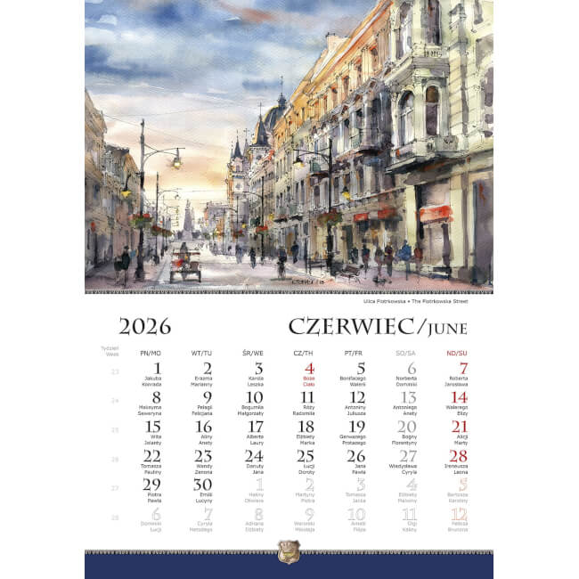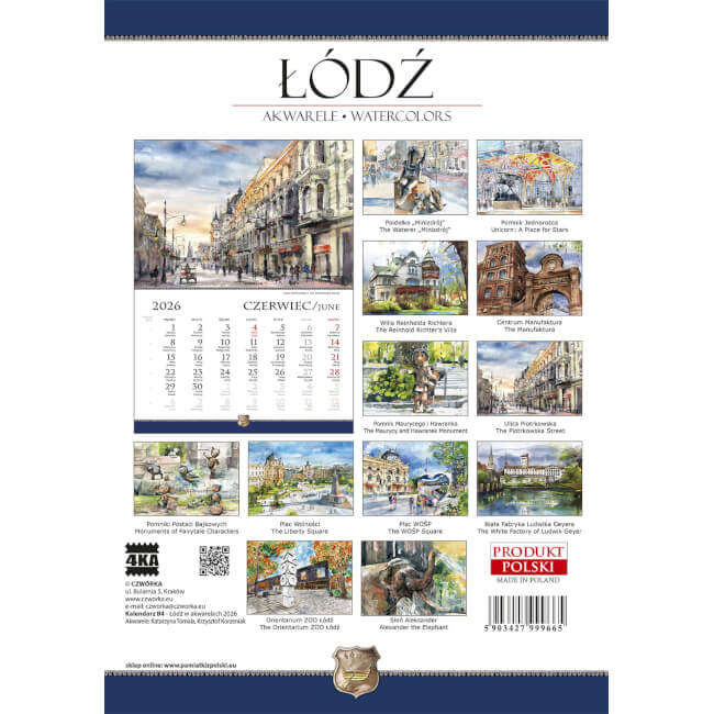 Calendrier polonais agrémenté d’aquarelles de Łódź, proposé en version à suspendre (mural).