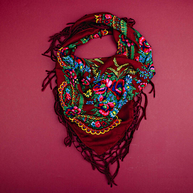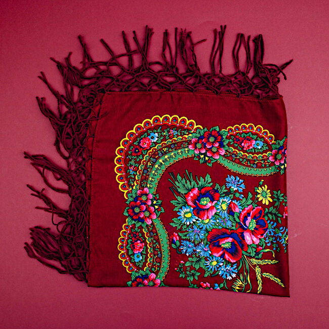 Autrefois, les foulards et châles étaient un élément indissociable du costume folklorique féminin dans presque toutes les régions de Pologne. Ce châle en coton peut être porté en complément à votre tenue en toutes saisons et de multiples façons : en écharpe, en pointe.