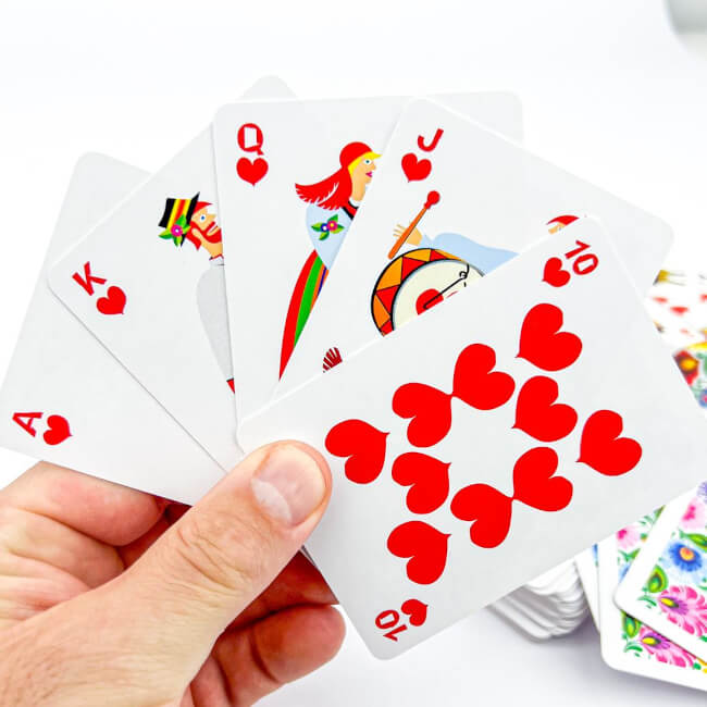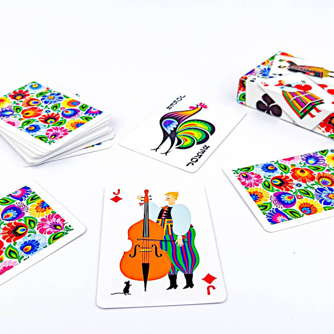 Jeu de 54 cartes, décorées de motifs Łowicz (oies, paysans et coqs). Elles trouveront certainement leur place dans le cœur des amateurs de cartes, des plus jeunes aux plus âgés.