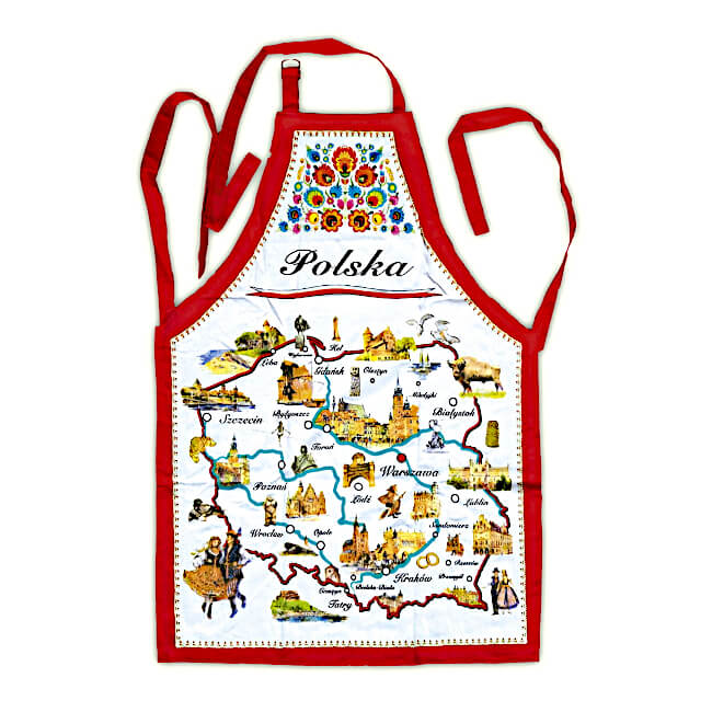Ce tablier de cuisine présente de manière artistique des architectures de Pologne. Dans la partie supérieure, se trouve une impression inspirée des découpes folkloriques de la région de Łowicz.